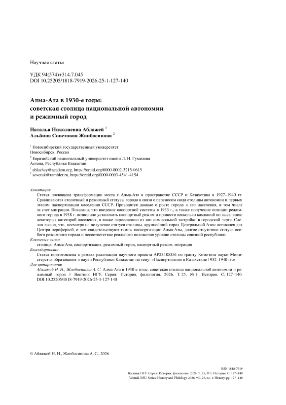 Ablazhey N. N., Zhanbossinova A. S. Alma-Ata in the 1930s: The Soviet Capital of National Autonomy and a Regime City. Vestnik NSU. Series: History and Philology , 2026, vol. 25, no. 1: History, pp. 127–140. (in Russ.)