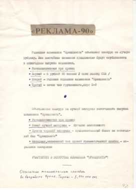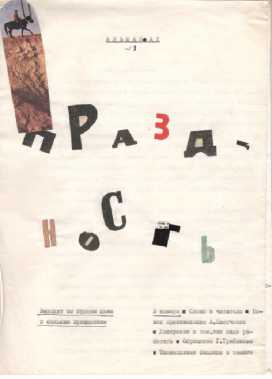 По крайней мере, машинопись альманаха содержит все признаки такой готовности. Это и макет обложки: на 1-м листе посредине вверху напечатано «Альманах № 1»; по центру название «Праздность», выполненное вырезанными из газет заголовочными буквами и наклеенными, как картинки, вразброс; внизу слева: «Выходит по будним дням (к) большим праздникам»; внизу справа: «В номере: “Слово к читателю”, Новое произведение А. Плитченко “Дискуссия о том, как надо работать”, Обращение Г. Трифонова «Талантливая баллада о хомяке”»1. Просмотр машинописного сборника показал, что в этом оглавлении пропущены материалы под названием «Социологический опрос» (сразу за «Словом…») и «Мы хотим курить!!!» (под рубрикой «Скандальная хроника»), а вместо произведения А. Плитченко дана его же краткая заметка: «Труд, да еще какой!». Последний лист оформлен рекламой и анонсами: наклеенная вырезка из газеты «РЕКЛАМА-90»; объявления о конкурсе на лучший материал новогоднего выпуска альманаха «Праздность»; внизу листа шариковой ручкой написано: «Отпечатано машинописным способом // во внерабочее время // Тираж 5.000.000 экз.»2. Всего в машинописи 12 листов формата А 4.