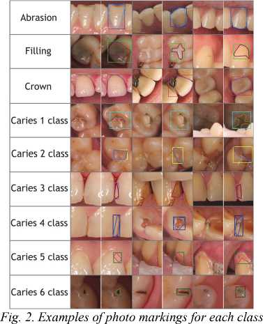 The decisive link in high–quality dental care is the accurate diagnostics, diagnosis, and treatment plan. Modern dentistry includes intraoral photo protocol in diagnostics. Currently, the analysis of photographs of the patient's teeth is a labor–intensive and energy–consuming process. Often, the process of detecting certain pathological processes in the oral cavity and dental defects can be complicated due to the doctor's fatigue during the work process, lack of time between the clinical appointments with patients and analysis of photographic data, which significantly complicates and extends the time for drawing up a treatment plan, in turn slowing down the decision–making process and the transition directly to treatment. Artificial intelligence methods can help the doctor in making a diagnosis.