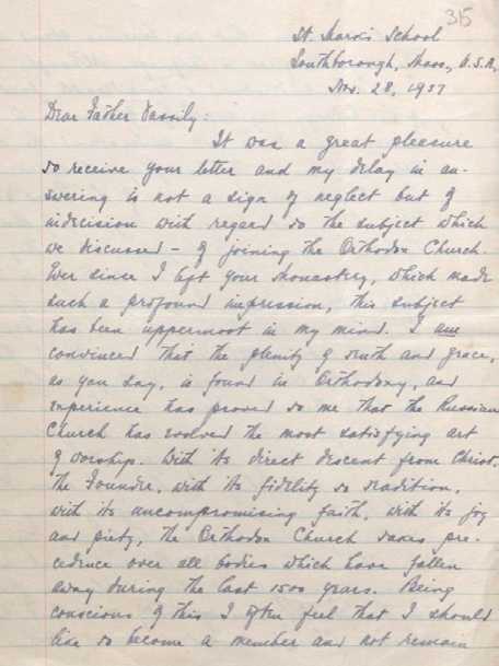 It was a great pleasure to receive your letter and my delay in answering is not a sign of neglect but of indecision with regard to the subject which we discussed — of joining The Orthodox Church. Ever since I left your Monastery, which made such a profound impression, this subject has been uppermost in my mind. I am convinced that the plenty of truth and grace, as you say, is found in Orthodoxy, and experience has proved to me that The Russian Church has evolved the most satisfying art of worship. With its direct descent from Christ, The Founder, with its fidelity to tradition, with its uncompromising faith, with its joy and piety, The Orthodox Church takes procedure over all bodies which have fallen away during the last 1500 years. Being conscious of this I often feel that I should like to become a member and not remain <316> just a visitor, but two barriers stand in the way. The first is language. Although I do now understand a considerable part of Liturgy, my knowledge of Russian is so meager that I do not understand the variable portions or the less frequent services like vespers or the services of the Great feasts. It is true that the great majority of Roman Catholics worship in a language which they do not understand, but that is contrary to Orthodox practice and I do not approve of it. It seems to me that a church member cannot enter fully into the worship if the words of the service mean nothing to him. The result is that he is thrown on his own resources for meditation and is not joining his voice with that of the Church. The second barrier is nationality. In theory I know the Orthodox Church does not recognize any discussion of nationality, but historical circumstances have divided the one Church into many self-sufficient, even exclusive groups. In this country it is especially true that the Russian Church is not to much Orthodox <316 об.> as Russian. The members are all Russian. The services and sermons are in that language. The Church is inextricably allied to Russian secular culture. The result is that Americans of English descent are not welcome and at best are regarded with suspicion as interlopers. Of course individuals in the Church like my dear friend. The nearby priest, are notable exceptions, but on the whole there is an atmosphere of hostility toward foreigners. I should be very much interested to learn what you think of these difficulties.