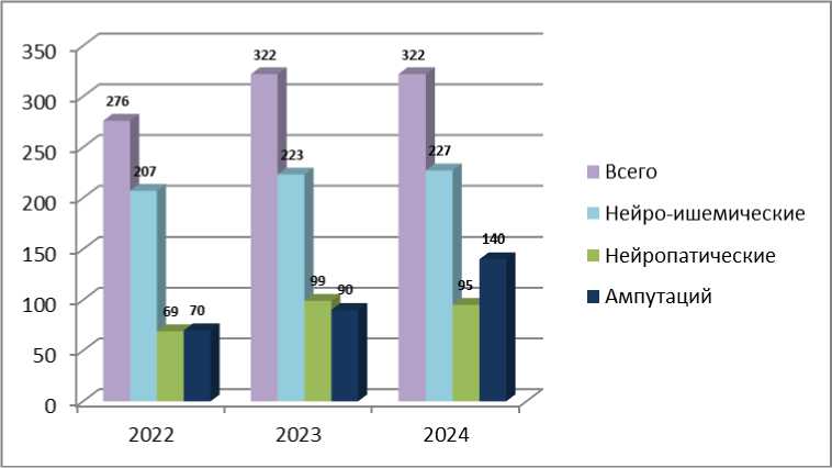 Рис. 2. Динамика обращений больных с разными формами синдрома диабетической стопы в 2022–2024 гг. по данным годовых отчетов кабинета «Диабетическая стопа»