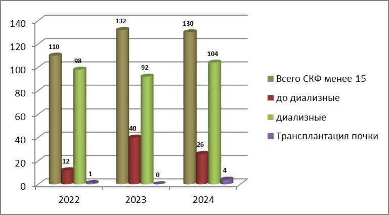 Диабетическая нефропатия является еще одним грозным инвалидизирующим и смертельно опасным осложнением сахарного диабета. Параллельно с ростом заболеваемости СД выросло количество пациентов с сахарным диабетом и значительно сниженной скоростью клубочковой фильтрации (менее 15 мл/мин/1.73 м²) на 18,1% в период с 2022 по 2024 г. (рис. 3). Число больных диабетом, впервые начавших диализ, с 2022 г. увеличилось на 71,4% (с 7 до 12 человек, в основном за счет СД 2-го типа). Эти данные подчеркивают необходимость усиления скрининга на альбуминурию и мониторинга СКФ у всех пациентов с СД, а также своевременного назначения нефропротективных препаратов [6; 7].