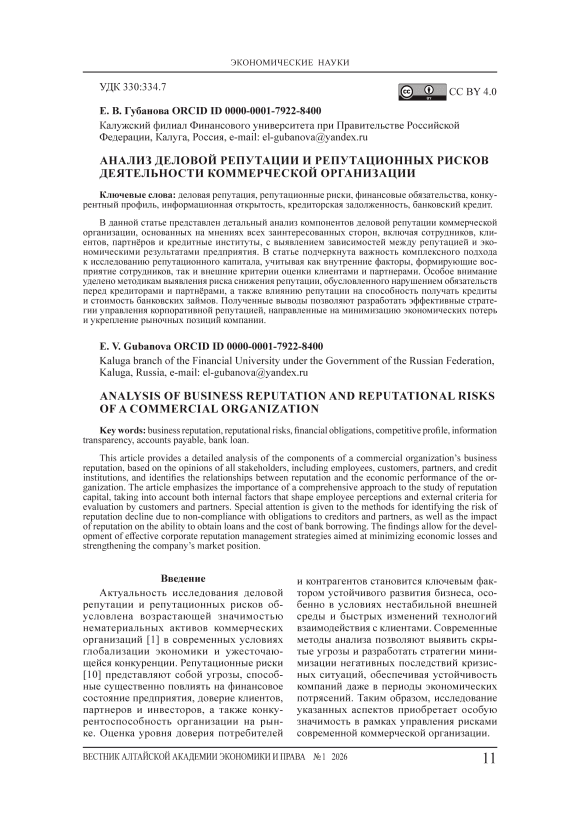 В данной статье представлен детальный анализ компонентов деловой репутации коммерческой организации, основанных на мнениях всех заинтересованных сторон, включая сотрудников, клиентов, партнёров и кредитные институты, с выявлением зависимостей между репутацией и экономическими результатами предприятия. В статье подчеркнута важность комплексного подхода к исследованию репутационного капитала, учитывая как внутренние факторы, формирующие восприятие сотрудников, так и внешние критерии оценки клиентами и партнерами. Особое внимание уделено методикам выявления риска снижения репутации, обусловленного нарушением обязательств перед кредиторами и партнёрами, а также влиянию репутации на способность получать кредиты и стоимость банковских займов. Полученные выводы позволяют разработать эффективные стратегии управления корпоративной репутацией, направленные на минимизацию экономических потерь и укрепление рыночных позиций компании.