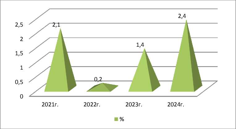 Данные рисунка 6 свидетельствуют о том, что CoR по кредитам, выданным физическим лицам имеет неоднозначную динамику. Так, если в 2023 г. он снизился до уровня 1,3 % при уровне 2022 г. - 2, 4%, то в 2024 г. данный показатель вырос и составил 2,1 %.. Это свидетельствует об ухудшении платёжного поведения населения, снижении качества кредитного портфеля физических лиц. Коммерческие банки увеличивают объём созданных резервов на покрытие кредитных рисков по розничному кредитному портфелю.