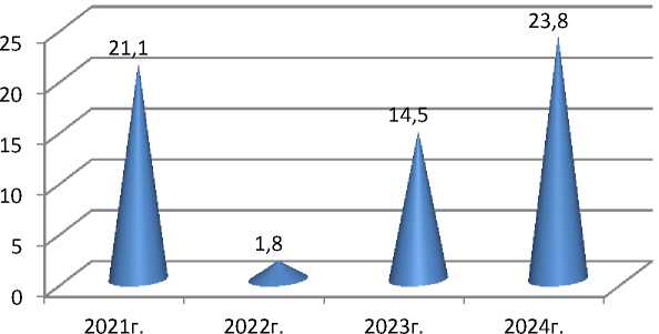 Аналогичный показатель рентабельности активов - рентабельность капитала также связан с динамикой чистой прибыли банковского сектора. При этом он также связан с изменением имеющегося капитала [7]. В целом можно сделать вывод о том, что рентабельность капитала увеличивается, в 2024 г. отмечается самый высокий уровень данного показателя 23,8 %, что выше уровня 2021 г., который составлял 21,1 %.