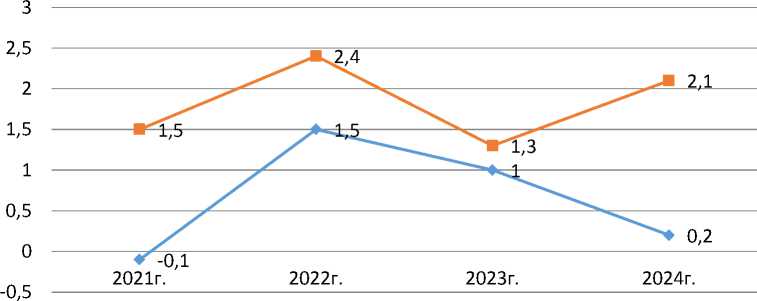 Данные рисунка 3 свидетельствуют о том, что после рекордно низких значений чистой прибыли в 2022 г. с 2023 г. увеличивается рентабельность активов, которая связана с тем, что чистая прибыль растёт большими темпами, чем активы банковского сектора. За 2024 г. отмечается наибольший уровень рентабельности активов, который составляет 2,1%