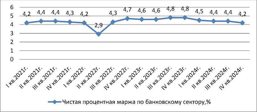 Анализируя динамику чистой процентной маржи, которая показывает прибыльность коммерческих банков сделать вывод о том, что самые низкие показатели относятся ко 2 кв. 2022 года, а наиболее высокий показатель отмечаются в 2023 г. Так, если во 2 кв. 2022г. чистая процентная маржа целом по банковскому сектору составляла всего 2,9%, то в 4 кв. 2023г.- 4,8%., в 4 кв. 2024г. процентная маржа целом по банкам незначительно снизилась и составляла 4,2 %.