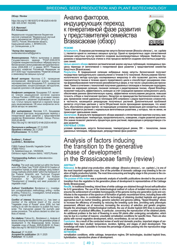 Актуальность. В мировом растениеводстве капуста белокочанная (Brassica oleracea L. var. capitata L.) является одной из значимых овощных культур. Одной из приоритетных задач отечественной селекции капустных культур является создание высокопродуктивных гибридов. Наиболее трудоемким и продолжительным этапом в этом процессе является создание константных родительских линий. Целью данного обзора являлся систематический анализ научных публикаций, посвященных процессу перехода от вегетативной к генеративной фазе развития у представителей семейства Капустные (Brassicaceae). Результаты. В традиционной селекции инбредные линии капусты белокочанной получают посредством принудительного самоопыления в течение 6-12 поколений. Использование биотехнологического метода культуры изолированных микроспор in vitro позволяет достичь полной гомозиготности генома в течение одного генеративного цикла и способствует расширению спектра формообразования генетических рекомбинантных форм, в том числе с рецессивными признаками. Также в сочетании с технологией получения удвоенных гаплоидов и геномными подходами, такими как маркерная селекция, геномная селекция и редактирование генома, «Speed Breeding» позволяет повысить эффективность селекции за счёт сокращения времени селекционного цикла, обеспечивая раннюю фенотипическую оценку, эффективное использование ресурсов, повышая точность отбора и генетический прогресс. Несмотря на преимущества биотехнологических методов, применение линий удвоенных гаплоидов (DH) сопряжено с рядом практических сложностей, в частности касающихся репродукции полученных растений. Дополнительной проблемой является отсутствие цветения у части DH-растений после прохождения яровизации, что может быть обусловлено рядом причин: не подходящие условиями яровизации для конкретных линий. Также отмечаются растения с нормальным вегетативным развитием, у которых, тем не менее, не происходит завязывание семян. Заключение. В результате проведенного обзора мировой и отечественной практики изучены важные этапы яровизации: температура, продолжительность, освещение, стадии развития растения. Эти знания позволят увеличить процентную долю растений, переходящих в репродуктивную стадию развития.