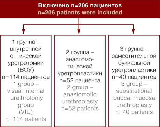 Fig.1. Research design клиническая больница»). Пациенты были разделены на 3 подгруппы в зависимости от типа выполненной операции: внутренней оптической уретротомии (ВОУ) (n=114), анастомотической уретропластики (n=52), заместительной буккальной уретропластики (n=40) (рис. 1).