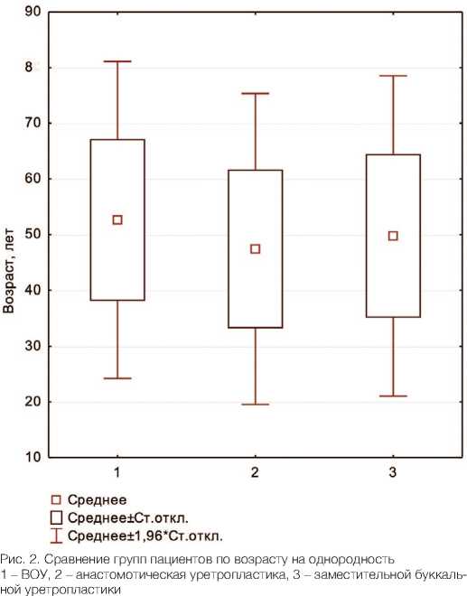 Полученные данные свидетельствуют, что пациенты значимо не отличались по возрасту. Однако было отмечено, что группа пациентов, которым выполнялась заместительная буккальная уретропла-стика, характеризовалась более длительным анамнезом, имели большее количество перенесенных операций, а также большую протяженность стриктуры уретры (5,36±0,41см) (табл. 1).