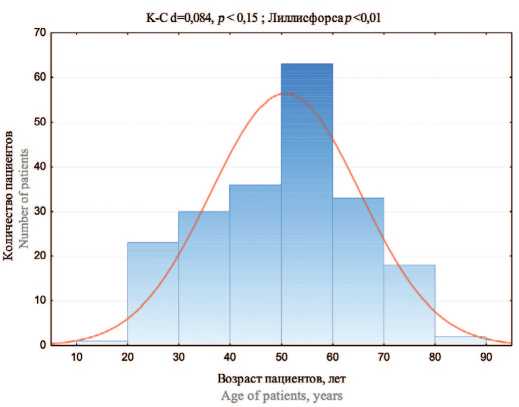 При анализе пациентов по возрасту группировка характеризуется нормальным распределением согласно критерию Колмогорова-Смирнова (рис. 3), следовательно выборка однородна.Возраст пациентов (X ̅ ±1,96×SD), составил 50,80±28,56 лет.