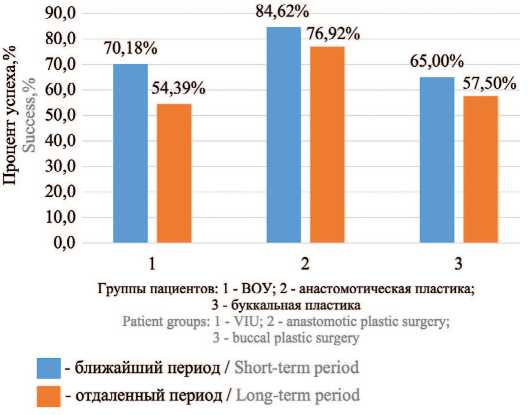 Кумулятивный процент успеха у пациентов трех групп после выполнения различных оперативных вмешательств типов оперативного лечения в ближайшем периоде составил 73,27%, в отдаленном периоде – 62,94%. Максимальный процент успеха в ближайшем периоде (<12 месяцев) отмечался в группе анастомотической уретропластики – 84,62%.