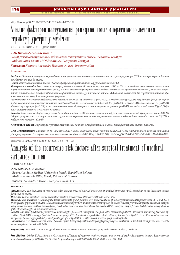 Введение. Частота наступления рецидивов после различных типов оперативного лечения стриктур уретры (СУ) по литературным данным колеблется от 15,6 до 36,4%. Целью исследования являлась оценка предикторов рецидивирования после хирургического лечения СУ. Материалы и методы. Был проведен анализ результатов лечения 206 пациентов, которым с 2010 по 2019 гг. проводился один из вариантов лечения: внутренняя оптическая уретротомия (ВОУ), анастомотическая уретропластика либо заместительная буккальная пластика. Для оценки результатов использовались однофакторный и многофакторный анализ, χ2, отношение шансов. ROC-анализ выполнялся для определения значения протяженности, влияющей на наступление рецидива. Результаты. Основными предикторами рецидива являлись: протяженные (p=0,037), многофокусные (p=0,039), рецидивные (p=0,016) стриктуры, увеличение числа предшествовавших операций (p=0,041), этиологический фактор СУ (p=0,042) – в группе ВОУ; локализация СУ (p=0,044), облитерация уретры (p=0,018) – после анастомотической уретропластики; возраст пациента (p=0,005), многофокусный тип СУ (p=0,014) – после заместительной буккальной пластики. Выводы. Максимальный процент успеха в ближайшем периоде (<12 месяцев) отмечался в группе анастомотической уретропластики – 84,62%. Общий процент успеха у пациентов трех групп после перенесенных типов оперативного лечения в ближайшем периоде составил 73,27%, в отдаленном периоде – 62,94%.