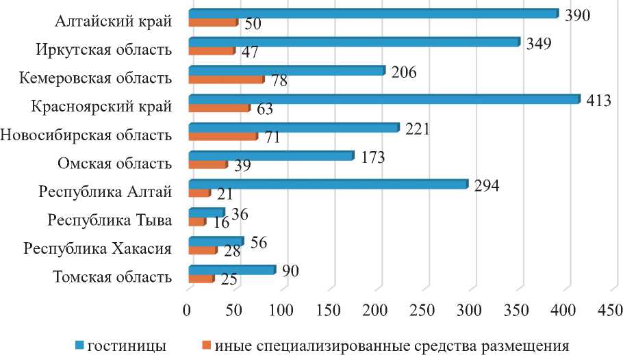 Делая вывод по данным СФО, видно, что количество отелей, емкость и номерной фонд средств размещения распределены неравномерно. И в связи с развитием активных видов туризма в Алтайском крае, Республике Алтай, Кемеровской и Иркутской областях преобладает спрос на специализированные средства размещения.