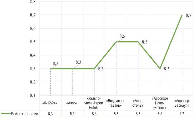 По анализу рейтинга и отзывов гостей (рис. 7) самый высокий балл имеет гостиница «Аэропорт Барнаул» (8,7) и отели «Воздушная гавань», «Аэроотель» – по 8,5 баллов.