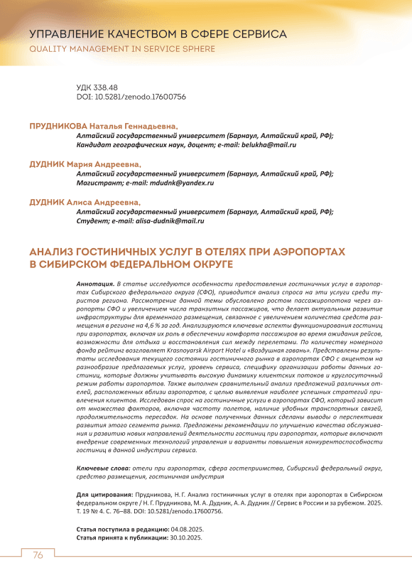 В статье исследуются особенности предоставления гостиничных услуг в аэропортах Сибирского федерального округа (СФО), приводится анализ спроса на эти услуги среди туристов региона. Рассмотрение данной темы обусловлено ростом пассажиропотока через аэропорты СФО и увеличением числа транзитных пассажиров, что делает актуальным развитие инфраструктуры для временного размещения, связанное с увеличением количества средств размещения в регионе на 4,6 % за год. Анализируются ключевые аспекты функционирования гостиниц при аэропортах, включая их роль в обеспечении комфорта пассажиров во время ожидания рейсов, возможности для отдыха и восстановления сил между перелетами. По количеству номерного фонда рейтинг возглавляет Krasnoyarsk Airport Hotel и «Воздушная гавань». Представлены результаты исследования текущего состоянии гостиничного рынка в аэропортах СФО с акцентом на разнообразие предлагаемых услуг, уровень сервиса, специфику организации работы данных гостиниц, которые должны учитывать высокую динамику клиентских потоков и круглосуточный режим работы аэропортов. Также выполнен сравнительный анализ предложений различных отелей, расположенных вблизи аэропортов, с целью выявления наиболее успешных стратегий привлечения клиентов. Исследован спрос на гостиничные услуги в аэропортах СФО, который зависит от множества факторов, включая частоту полетов, наличие удобных транспортных связей, продолжительность пересадок. На основе полученных данных сделаны выводы о перспективах развития этого сегмента рынка. Предложены рекомендации по улучшению качества обслуживания и развитию новых направлений деятельности гостиниц при аэропортах, которые включают внедрение современных технологий управления и варианты повышения конкурентоспособности гостиниц в данной индустрии сервиса.