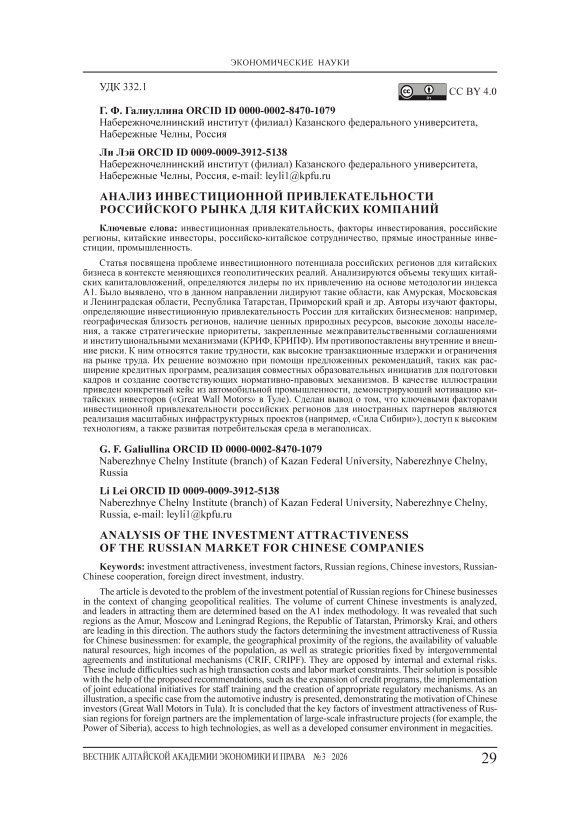 Статья посвящена проблеме инвестиционного потенциала российских регионов для китайских бизнеса в контексте меняющихся геополитических реалий. Анализируются объемы текущих китайских капиталовложений, определяются лидеры по их привлечению на основе методологии индекса А1. Было выявлено, что в данном направлении лидируют такие области, как Амурская, Московская и Ленинградская области, Республика Татарстан, Приморский край и др. Авторы изучают факторы, определяющие инвестиционную привлекательность России для китайских бизнесменов: например, географическая близость регионов, наличие ценных природных ресурсов, высокие доходы населения, а также стратегические приоритеты, закрепленные межправительственными соглашениями и институциональными механизмами (КРИФ, КРИПФ). Им противопоставлены внутренние и внешние риски. К ним относятся такие трудности, как высокие транзакционные издержки и ограничения на рынке труда. Их решение возможно при помощи предложенных рекомендаций, таких как расширение кредитных программ, реализация совместных образовательных инициатив для подготовки кадров и создание соответствующих нормативно-правовых механизмов. В качестве иллюстрации приведен конкретный кейс из автомобильной промышленности, демонстрирующий мотивацию китайских инвесторов («Great Wall Motors» в Туле). Сделан вывод о том, что ключевыми факторами инвестиционной привлекательности российских регионов для иностранных партнеров являются реализация масштабных инфраструктурных проектов (например, «Сила Сибири»), доступ к высоким технологиям, а также развитая потребительская среда в мегаполисах.