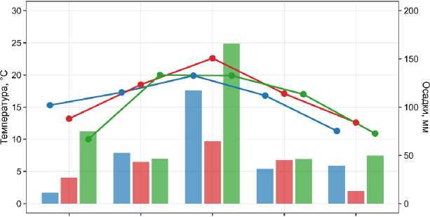 Рис. 1 . Изменение среднемесячных температурного режима и количества выпавших осадков по месяцам вегетационного периода (май-сентябрь) в южной лесостепи Омской области в годы проведения исследований