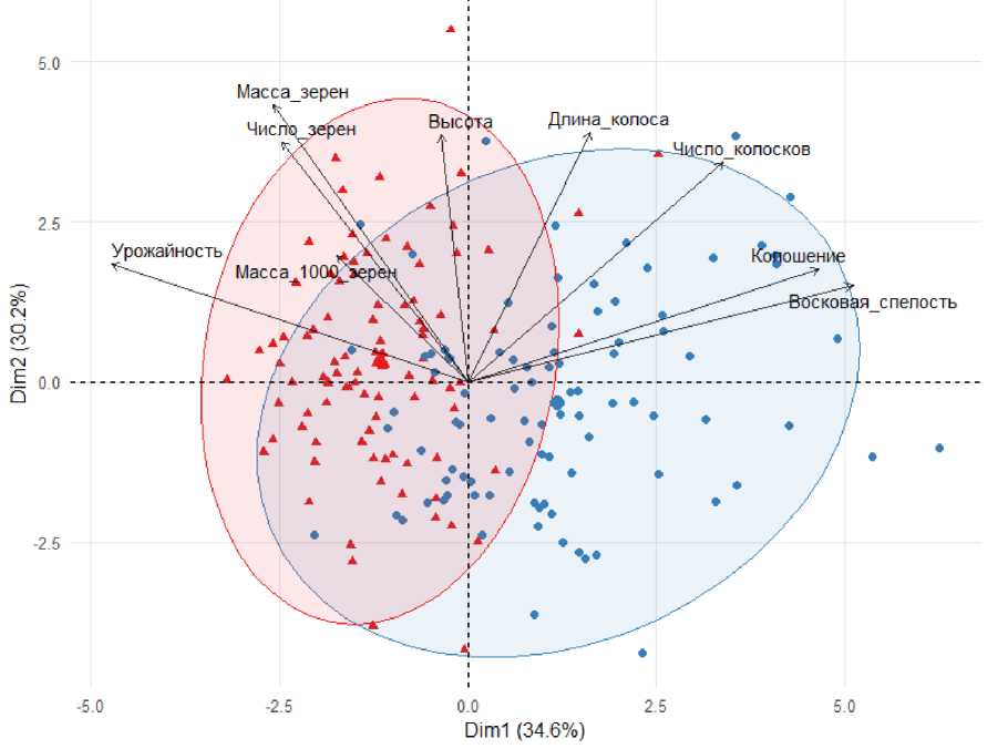 Метод главных компонент (PCA) позволил визуализировать и количественно оценить различия между изученными генотипами (рис. 2). Первые две главные компоненты (Dim1 и Dim2) суммарно объяснили 64,8% общей изменчивости признаков (34,6 и 30,2% соответственно), подтверждая о репрезентативности построенной модели.