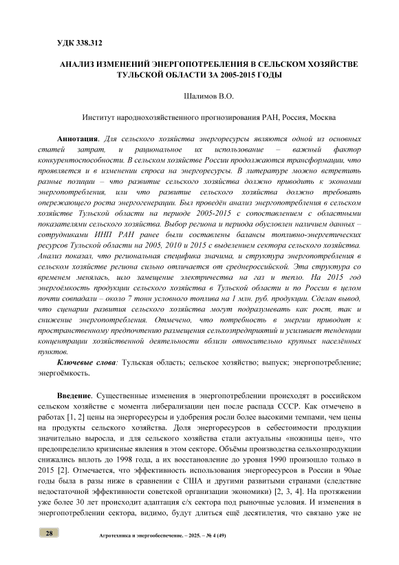 Для сельского хозяйства энергоресурсы являются одной из основных статей затрат, и рациональное их использование – важный фактор конкурентоспособности. В сельском хозяйстве России продолжаются трансформации, что проявляется и в изменении спроса на энергоресурсы. В литературе можно встретить разные позиции – что развитие сельского хозяйства должно приводить к экономии энергопотребления, или что развитие сельского хозяйства должно требовать опережающего роста энергогенерации. Был проведён анализ энергопотребления в сельском хозяйстве Тульской области на периоде 2005-2015 с сопоставлением с областными показателями сельского хозяйства. Выбор региона и периода обусловлен наличием данных – сотрудниками ИНП РАН ранее были составлены балансы топливно-энергетических ресурсов Тульской области на 2005, 2010 и 2015 с выделением сектора сельского хозяйства. Анализ показал, что региональная специфика значима, и структура энергопотребления в сельском хозяйстве региона сильно отличается от среднероссийской. Эта структура со временем менялась, шло замещение электричества на газ и тепло. На 2015 год энергоёмкость продукции сельского хозяйства в Тульской области и по России в целом почти совпадали – около 7 тонн условного топлива на 1 млн. руб. продукции. Сделан вывод, что сценарии развития сельского хозяйства могут подразумевать как рост, так и снижение энергопотребления. Отмечено, что потребность в энергии приводит к пространственному предпочтению размещения сельхозпредприятий и усиливает тенденции концентрации хозяйственной деятельности вблизи относительно крупных населённых пунктов.