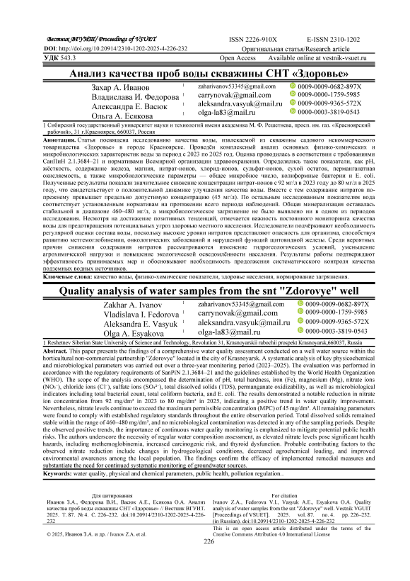 DOI: Оригинальная статья/Research article УДК 543.3 Open Access Available online at Анализ качества проб воды скважины СНТ «Здоровье» Захар А. Иванов 1 Владислава И. Федорова 1 Александра Е. Васюк 1 Ольга А. Есякова 1 0009-0009-0682-897X © 0009-0000-1759-5985 © 0009-0009-9365-572X © 0000-0003-3819-0543