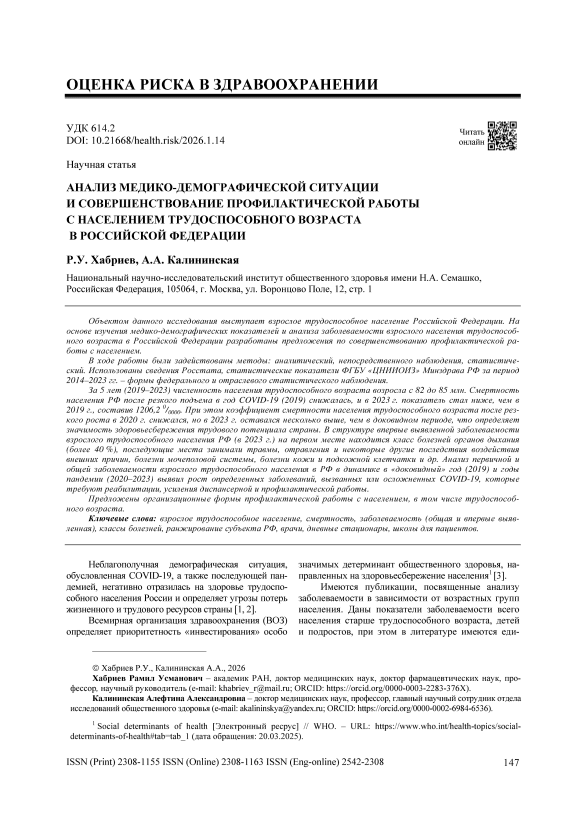 Объектом данного исследования выступает взрослое трудоспособное население Российской Федерации. На основе изучения медико-демографических показателей и анализа заболеваемости взрослого населения трудоспособного возраста в Российской Федерации разработаны предложения по совершенствованию профилактической работы с населением. В ходе работы были задействованы методы: аналитический, непосредственного наблюдения, статистический. Использованы сведения Росстата, статистические показатели ФГБУ «ЦНИИОИЗ» Минздрава РФ за период 2014–2023 гг. – формы федерального и отраслевого статистического наблюдения. За 5 лет (2019–2023) численность населения трудоспособного возраста возросла с 82 до 85 млн. Смертность населения РФ после резкого подъема в год COVID-19 (2019) снижалась, и в 2023 г. показатель стал ниже, чем в 2019 г., составив 1206,2 0/0000. При этом коэффициент смертности населения трудоспособного возраста после резкого роста в 2020 г. снижался, но в 2023 г. оставался несколько выше, чем в доковидном периоде, что определяет значимость здоровьесбережения трудового потенциала страны. В структуре впервые выявленной заболеваемости взрослого трудоспособного населения РФ (в 2023 г.) на первом месте находится класс болезней органов дыхания (более 40 %), последующие места занимали травмы, отравления и некоторые другие последствия воздействия внешних причин, болезни мочеполовой системы, болезни кожи и подкожной клетчатки и др. Анализ первичной и общей заболеваемости взрослого трудоспособного населения в РФ в динамике в «доковидный» год (2019) и годы пандемии (2020–2023) выявил рост определенных заболеваний, вызванных или осложненных COVID-19, которые требуют реабилитации, усиления диспансерной и профилактической работы. Предложены организационные формы профилактической работы с населением, в том числе трудоспособного возраста.