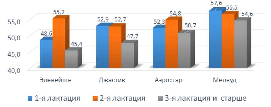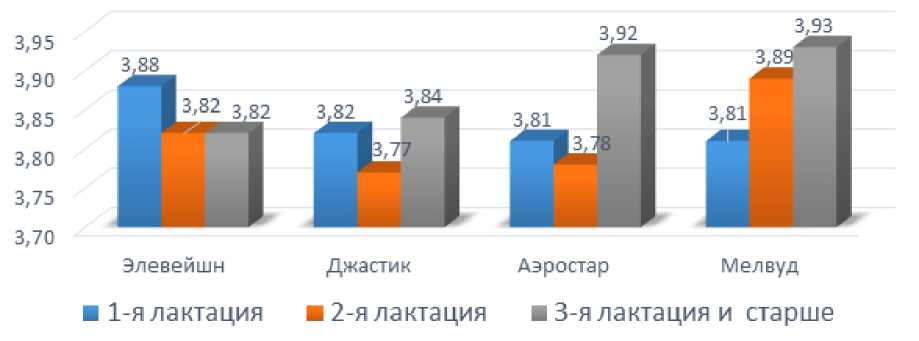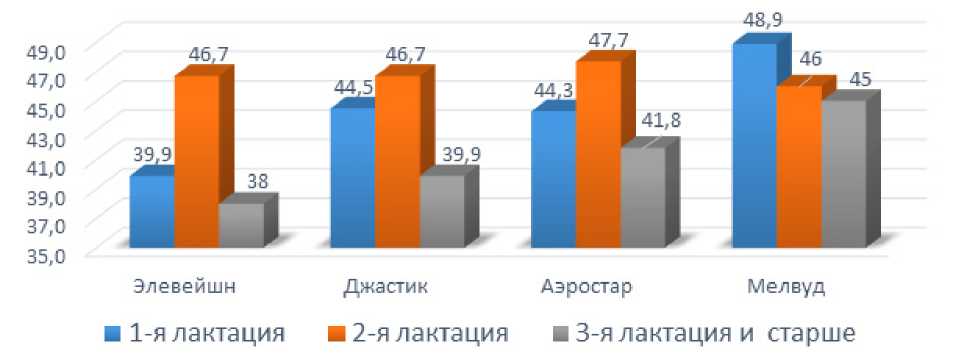 На основании рисунка 5 установлено, что абсолютные показатели массовой доли жира в молоке у первотелок оказались больше у коров линии Элевейшн (3,90%), у коров старших возрастов – в линии Мелвуда (3,93%), также, как и среди животных 2-й лактации (3,89%).