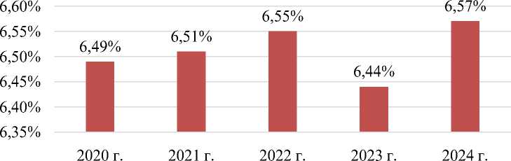 Представленные на рис. 1 данные отражают относительную стабильность удельного веса сельскохозяйственных организаций в общем числе хозяйствующих субъектов РФ, который колебался в диапазоне от 6,4 до 6,6%. Такая динамика свидетельствует о сохранении устойчивой позиции сельского хозяйства в структуре национальной экономики [3].
