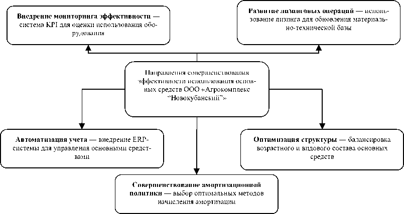 На основе проведенного анализа основных средств ООО «Агрокомплекс “Новокубанский”» были разработаны конкретные направления совершенствования управления основными средствами. Их реализация позволит повысить эффективность использования техники и оборудования, а также оптимизировать финансовые затраты [3].