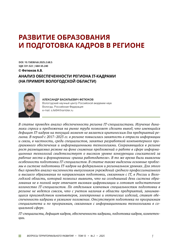 В статье проведен анализ обеспеченности региона ИТ-специалистами. Изучение динамики спроса и предложения на рынке труда позволяет сделать вывод, что имеющийся дефицит IT-кадров на текущий момент не является критическим для предприятий региона. В период с 2017–2023 гг. в регионе повысилась занятость в отрасли информации и связи, в частности, среди специалистов, занятых разработкой компьютерного программного обеспечения и информационными технологиями. Сохраняющийся в регионе рост размещаемых резюме на фоне снижения предложений о работе в сфере информационных технологий свидетельствует о высоком уровне конкуренции соискателей за рабочие места и формировании «рынка работодателя». В то же время были выявлены особенности подготовки ИТ-специалистов. В статье также выделены основные проблемы в системе подготовки ИТ-кадров на федеральном и региональном уровнях. Для этого был проведен анализ численности выпускников учреждений среднего профессионального и высшего образования по направлениям подготовки, связанным с ИТ, в России и Вологодской области, который позволил выявить, что на сегодняшний день система образования не в полной мере отвечает вызовам цифровизации и готовит недостаточное количество ИТ-специалистов. По отдельным ключевым специальностям подготовка в регионе не ведется совсем, что с учетом наличия в области предприятий, занимающихся производством компьютеров, электронных и оптических изделий, ставит обеспеченность кадрами в уязвимое положение. Отсутствует подготовка по программам специалитета и по программам, связанным с информационными технологиями в социальной сфере.