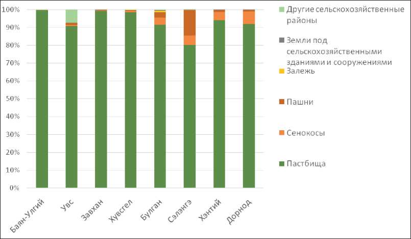В структуре землепользования на рассматриваемых территориях отчетливо видно преобладание земель сельскохозяйственного назначения, но в трех аймаках, таких как Хувсгел, Булган и Сэлэнгэ, заметна доля земель лесного фонда (рис. 1). Если рассматривать структуру сельскохозяйственных земель, то здесь во всех аймаках преобладание пастбищ, только в аймаке Сэлэнгэ присутствуют пашни (около 15 %), в аймаках Булган, Сэлэнгэ, Хэнтий и Дорнод имеются сенокосы (рис. 2).