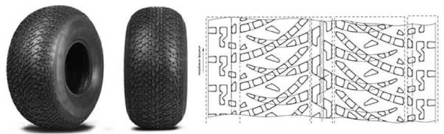 При проектировании рисунка протектора его коэффициент полноты kn (насыщенность) выбирается в зависимости от эксплуатационного назначения шин. Под коэффициентом полноты kn понимается отношение площади выступающих частей протектора к общей площади беговой части шины. Для шин вездеходного типа kn наименьший ( kn = 0,40-0,60). Протекторы с kn< 0,40