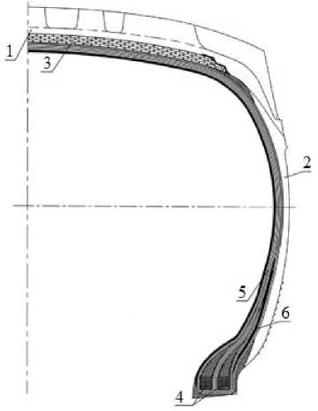 4 – bead rings; 5 – inner layers of the rubberized cord frame; 6 – outer layers of the rubberized cord frame