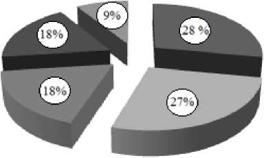 Диаграмма процентного распределения направлений технических решений элементов протектора представлена на рис. 6. Она показывает, что основное направление патентования технических решений элементов протектора ориентировано на улучшение самоочищаемости протектора (28 %), снижение сопротивления качению и повышение проходимости (27 %), улучшение тягово-сцепных свойств при сохранении поверхностного слоя грунтов низкой несущей способностью (18 %), улучшение шумовых характеристик (18 %), повышение устойчивости к износу (9 %).