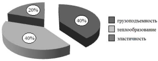 Диаграмма процентного распределения направлений технических решений формы и внутреннего устройства шины представлена на рис. 7. Из нее видно, что в основном патентование ориентировано на повышение грузоподъемности при сохранении вездеходных свойств (40 %), снижение теплообразования в каркасе и повышение его работоспособности (40 %), достижение оптимальной эластичности и исключение эффекта буксования (20 %).