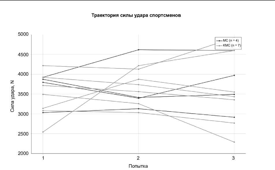 Методика и организация исследования . В исследовании приняли участие 11 высококвалифицированных мужчин-боксеров: 4 спортсмена – спортивные мастера (МС) и 7 спортсменов – кандидаты в мастера спорта (КМС). Средний возраст составил 18,80 ± 0,78 лет, средний стаж занятий боксом – 8,64 ± 2,34 года, средний рост – 181,73 ± 9,01 см, средняя масса тела – 78,64 ± 14,12 кг. Для выполнения тестов использовались сертифицированные боксеровские перчатки GREEN HILL (12 oz). Измерение силы удара осуществлялось с помощью тензометрического измерителя удара (песочный мешок-измеритель) марки CROCUS, сертифицированного соответствующей Российской федерацией бокса. Тестирования проводились с 13:00 до 16:00 в боксерском зале Российского университета спорта «ГЦОЛИФК» с участием 11 квалифицированных спортсменов. Процедура тестирования была разработана в строгом соответствии с официальными правилами дисциплины «Удар на силу», утвержденной Министерством спорта РФ в январе 2024 г. После общей разминки продолжительностью 1–3 минуты выполнялся протокол нанесения ударов: первая тренировочная попытка, за которой следовали три зачетные попытки, при этом результат участника определялся как максимальный показатель силы удара из трех зачетных попыток. Технические требования включали: одиночные удары любого типа (прямой, боковой, снизу), выполняемые правой или левой рукой без разбега, прыжков или иного ускорения перед ударом, с допущением только одного шага каждой ногой, наносимые строго из установленного места сжатым кулаком (частью перчатки, закрывающей фаланги пальцев). Для статистической обработки данных использовались программные пакеты OriginPro2024b и Microsoft Excel 2024. Все количественные показатели представлены в виде среднего арифметического и стандартного отклонения (M±SD). Нормальность распределения проверялась с помощью критерия Шапиро – Уилка. Для сравнения групп по количественным показателям применялся t-критерий Стьюдента для независимых выборок. В случаях отклонения от нормального распределения использовался непараметрический U-критерий Манна – Уитни. Сравнение распределения категориальных переменных (типов траекторий) между группами проводилось с помощью критерия хи-квадрат (χ²) с поправкой Йейтса. При ожидаемых частотах менее 5 в более чем 20 % ячеек применялся точный критерий Фишера. Оценка взаимосвязи между средними показателями силы удара и коэффициентом вариации выполнялась с помощью непараметрического коэффициента корреляции Спирмена (ρ) в связи с малым объемом выборки и потенциальным отклонением от нормального распределения. Для оценки величины эффекта при сравнении групп использовались следующие показатели: Cohen’s d для t-критерия Стьюдента, Cramér’s V для критерия хи-квадрат, r = Z/√N для U-критерия Манна – Уитни. Надежность тестирования оценивалась с помощью внутриклассового коэффициента корреляции (ICC) в двухсторонней смешанной модели с определением абсолютного согласия. Для всех видов статистического анализа уровень статистической значимости устанавливался при p < 0,05.