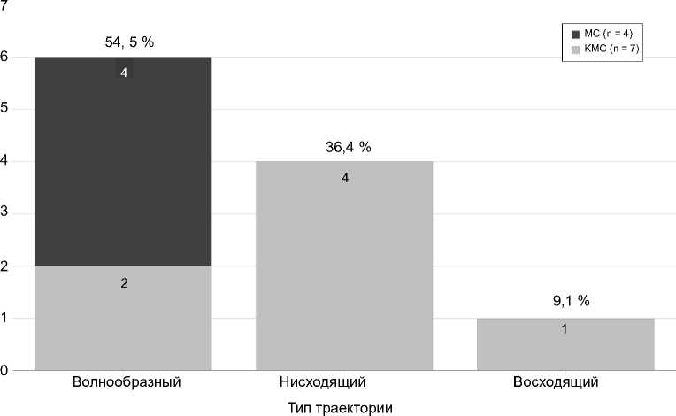 Волнообразный тип траектории (n = 6, 54,5 %) характеризовался наличием пика силы во второй попытке с последующим снижением или поддержанием уровня в третьей попытке. Этот тип был наиболее распространенным в общей выборке.