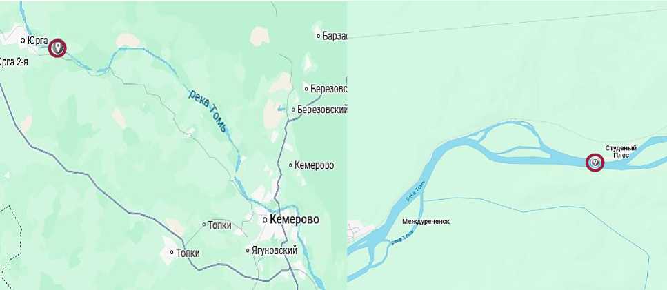 Исследуемые виды рыб подвергались отлову в р. Томь Кемеровской области, п. Речной, и в р. Томь Кемеровской области, п. Студёный Плёс, приблизительное географическое место отлова которых указано на рисунке 1. В области аквакультуры существуют постоянные и новые проблемы, требующие регулярных исследований и разработок. Ведущей задачей является эффективное управление стоками, богатыми питательными веществами, которые представляют риск эвтрофикации и нарушения экологии, а также влияние на местное биоразнообразие [8]. Изучение сложных взаимодействий физических, химических и биологических факторов, влияющих на характеристики сточных вод и эффективность очистки, подчеркивает значимость эффективного управления сточными водами в аквакультуре.