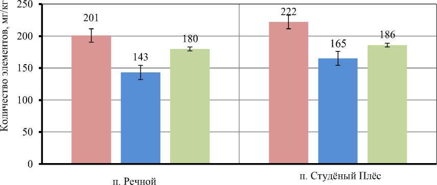 При сравнении полученных результатов лабораторных исследований из разных мест отбора проб было установлено различие показателей химических элементов. Визуальное представление статистического сравнения показателей химических элементов представлено на рисунке 5. Сравнительный анализ показателей химических элементов в пробах, отобранных в р. Томь п. Речной и п. Студёный Плёс, выявил их различие. Было установлено, что концентрации исследуемых элементов из п. Студёный Плёс превышали аналогичные значения, зафиксированные в п. Речной. Наибольшее различие отмечено между показателями фосфора (Δ = 543) и кальция (Δ = 278), в остальных показателях разница не превышала 150 мг/кг.