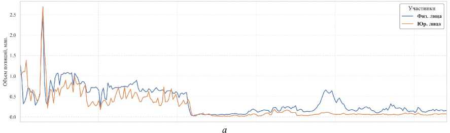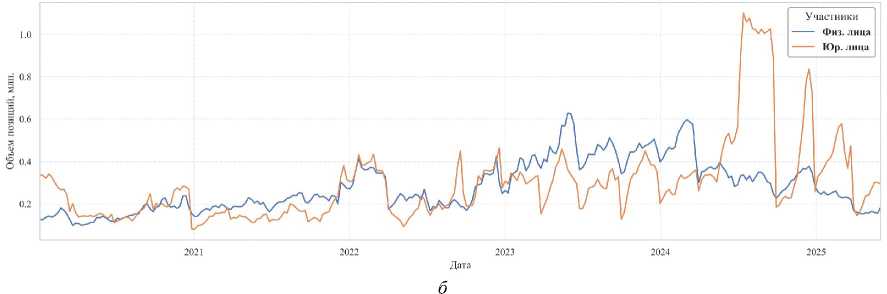 Графический анализ подтверждает и дополняет выводы из таблицы, выявляя важные структурные различия. Рисунок 1, а наглядно демонстрирует ключевое изменение на рынке Brent: после резкого всплеска активности в начале 2020 г. (период высокой волатильности на нефтяном рынке из-за пандемии COVID-19), с начала 2022 г. наблюдается резкое и устойчивое снижение общего объема открытых позиций у обеих групп инвесторов. Это может быть связано как со структурными изменениями в российской экономике, так и со снижением интереса к инструменту. На рынке SBER (рис. 1, б ), напротив, виден устойчивый, хотя и волатильный растущий тренд в активности обеих групп инвесторов на протяжении всего периода после 2022 г., что свидетельствует о сохранении и даже увеличении интереса к фондовому сегменту срочного рынка.