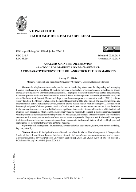 Статья посвящена разработке инструментов для диагностики и управления финансовыми рисками на срочном рынке России. Целью исследования является апробация методики сравнительного анализа данных об открытых позициях на товарном (фьючерс на нефть Brent) и фондовом (фьючерс на акции Сбербанка) сегментах. Методологической базой выступают авторегрессионные эконометрические модели (AR(1)), построенные на недельных данных Московской Биржи и Банка России за 2020–2025 годы. Основным результатом является доказательство гетерогенной реакции участников рынка на макроэкономические шоки. Установлено, что на товарном рынке рост волатильности (индекс RVI) вызывает уход от риска у физических лиц, но не влияет на юридических лиц, подтверждая их хеджирующую функцию. На фондовом рынке рост волатильности приводит к синхронному сокращению позиций у обеих групп. Выводы показывают, что сравнительный анализ открытого интереса позволяет диагностировать природу рыночных рисков, отделяя реакцию на панику от реакции на фундаментальные факторы.