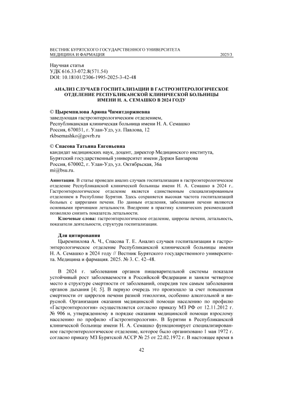 В статье проведен анализ случаев госпитализации в гастроэнтерологическое отделение Республиканской клинической больницы имени Н. А. Семашко в 2024 г.. Гастроэнтерологическое отделение является единственным специализированным отделением в Республике Бурятия. Здесь сохраняется высокая частота госпитализаций больных с циррозами печени. По данным отделения, заболевания печени являются основными причинами летальности. Внедрение в практику клинических рекомендаций позволило снизить показатель летальности.