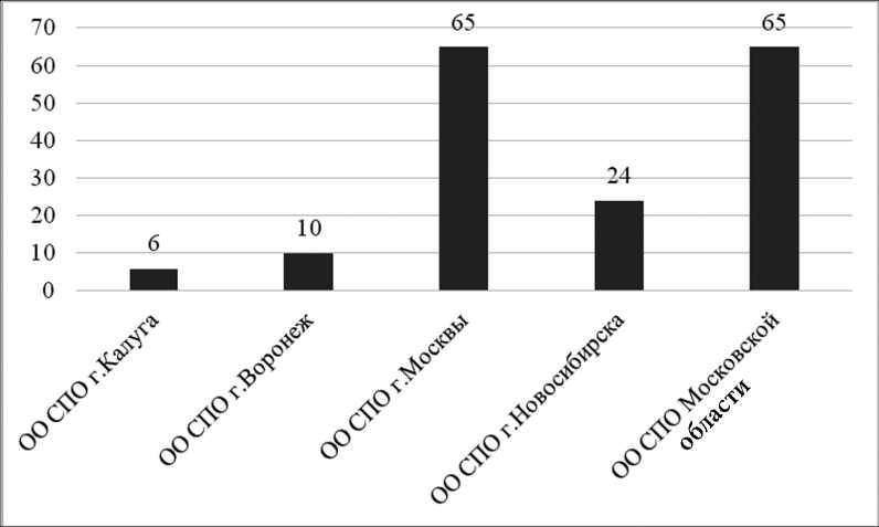 Рисунок 1. Количество изученных сайтов образовательных организаций СПО по городам Источник: здесь и далее рисунки выполнены автором.