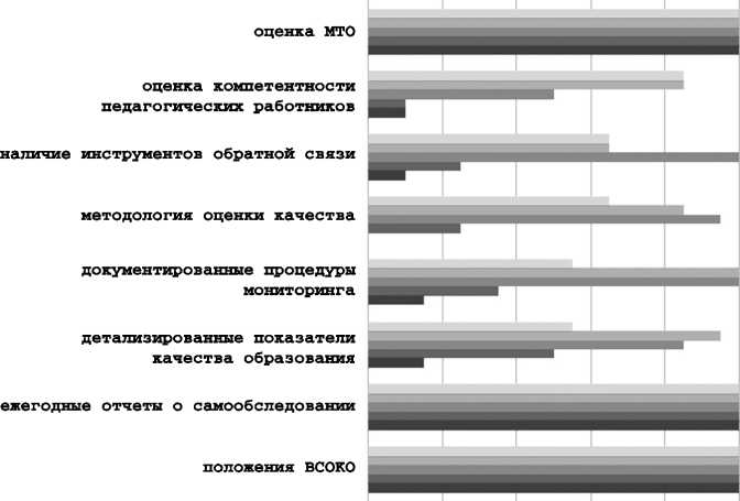 таны локальные акты, регламентирующие процедуры оценивания (Рисунок 2). Около 25 % колледжей Московской области имеют полноценно функционирующую ВСОКО с цифровыми решениями, и порядка 55 % колледжей демонстрируют средний уровень внедрения ВСОКО. Примерно 20 % организаций ограничиваются формальным выполнением требований. Положительные тенденции реализации ВСОКО в московских колледжах заключаются в интеграции ВСОКО с системой эффективного контракта педагогов и вовлечением работодателей в оценку качества образования. Использование цифровых платформ для мониторинга и анализа данных позволяет в некоторой степени автоматизировать результаты мониторинга качества образования.
