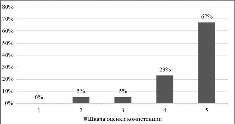 Оценка уровня сформированности общих и профессиональных компетенций преимущественно положительная: большинство респондентов (67 %) оценивают уровень компетенций выпускников по шкале в 5 баллов. 23 % респондентов оценивают уровень сформированности компетенций на 4 балла; на 3 и 2 балла оценивают 5 % респондентов. (см. Рисунок 3).