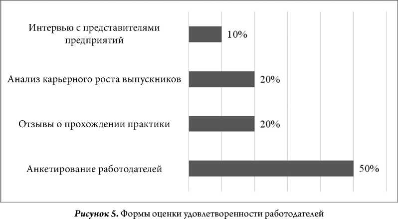Анализ форм оценки удовлетворенности работодателей (см. Рисунок 5) показывает преобладание анкетирования как наиболее распространенного метода получения обратной связи об удовлетворенности. Другие методы используются значительно реже.