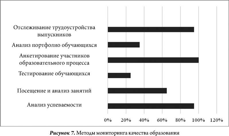 Среди наиболее распространенных методов мониторинга качества образования выявлены следующие: анкетирование участников образовательного процесса – 100 %, анализ успеваемости – 95 %, отслеживание трудоустройства выпускников – 95 % и посещение и анализ занятий – 65 %. Менее используемые методы мониторинга оценки качества: анализ портфолио обучающихся – 35 % и тестирование обучающихся – 25 % (Рисунок 7).