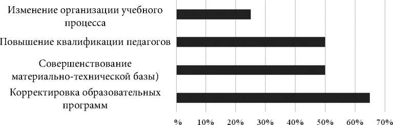 Участниками процедур внутреннего аудита являются администрация – 100 %, председатели ПЦК – 100 %, преподаватели – 65 %, представители работодателя – 50 %, методисты – 25 %. Внешние эксперты участвуют в 15 % случаев. Представители работодателя участвуют в 50 % процедур аудита, но при этом 85 % работодателей не оценивают образовательные программы. Это может свидетельствовать о формальном подходе в оценке удовлетворенности результатами реализации образовательной программы работодателями. Только в 65 % случаев результаты аудитов приводят к корректировке образовательных программ, и лишь в 25 % – к изменениям в организации учебного процесса, что может говорить о формальном характере проводимых аудитов (см. Рисунок 9).