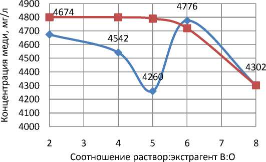 На рис. 2 приведена зависимость концентрации извлеченной меди от соотношения В:О. Ожидаемый результат был спрогнозирован после проведения опытов.