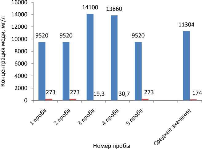 Результаты концентрации меди в экстракте и остаточная концентрация меди в растворе (рафинате) показаны на рис. 7.